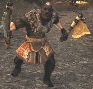 The Half-trolls were bestowed as a gift by Sauron to the Haradrim, the tribesmen of southern Middle-earth. They have accompanied the Men of Harad and the Corsairs of Umbar in their invasion of Gondor, working as servants, slaves, and elite warriors of the Southron army.