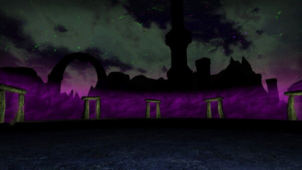 The sky above the landscape turns a cursed hue when in close proximity to a Shadow Rift