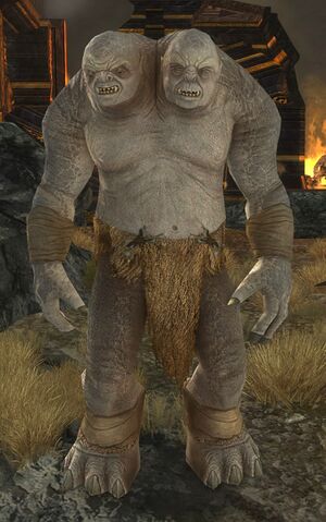 Two-headed Trolls are a rare and terrifying breed of Troll-kind. They are much larger than ordinary Trolls, possessing a towering height that rivals that of many Giants. Their skin is a stony grey hue and they have wide, flat feet like those of an Oliphaunt which they use to stomp their prey into submission. Their most unsettling feature though is their pair of heads, each of which often has its own name and personality. It's unclear whether the Two-headed Trolls are malformed freaks of nature or an intentional creation of the Dark Lord Sauron. Whatever the case, they have proven to be very real and dangerous foes.