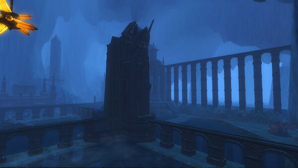 The Water-works territory consists of a single, gigantic cavern beneath the mountain, which a network of aqueducts divides into orderly sections. Hulking edifices—from functional palaces to lofty pillars—stand where lines of aqueducts intersect. In the east, this neat plan meets the cavern wall at a series of modest buildings and plazas punctuated with stained-glass windows. An arched passage here connects to the Burning Stair and, thus, The Flaming Deeps beyond. In the west, the plan gives way near the cavern wall to a short wilderness of mushrooms, shoals, and stalagmites known as the Drowned Deep. [1]